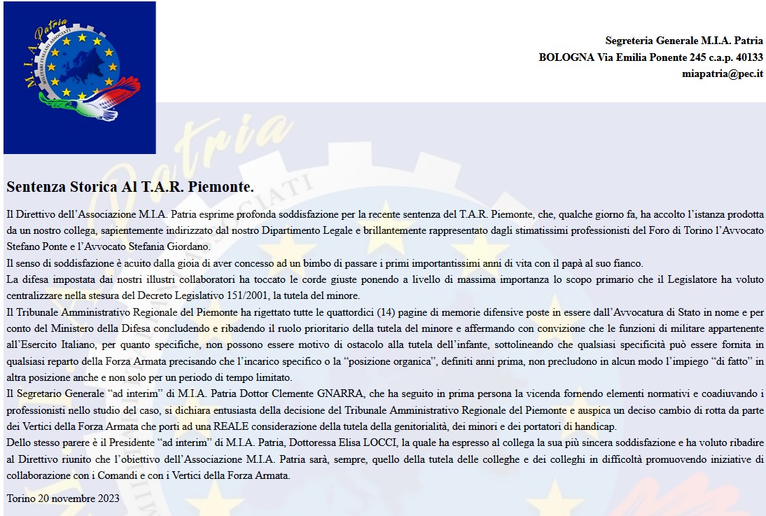 Mia Patria Segnalazione Benefici Familiari segnalazione scarsa considerazione necessità familiari e applicazione “contra legem” della norma vigente
